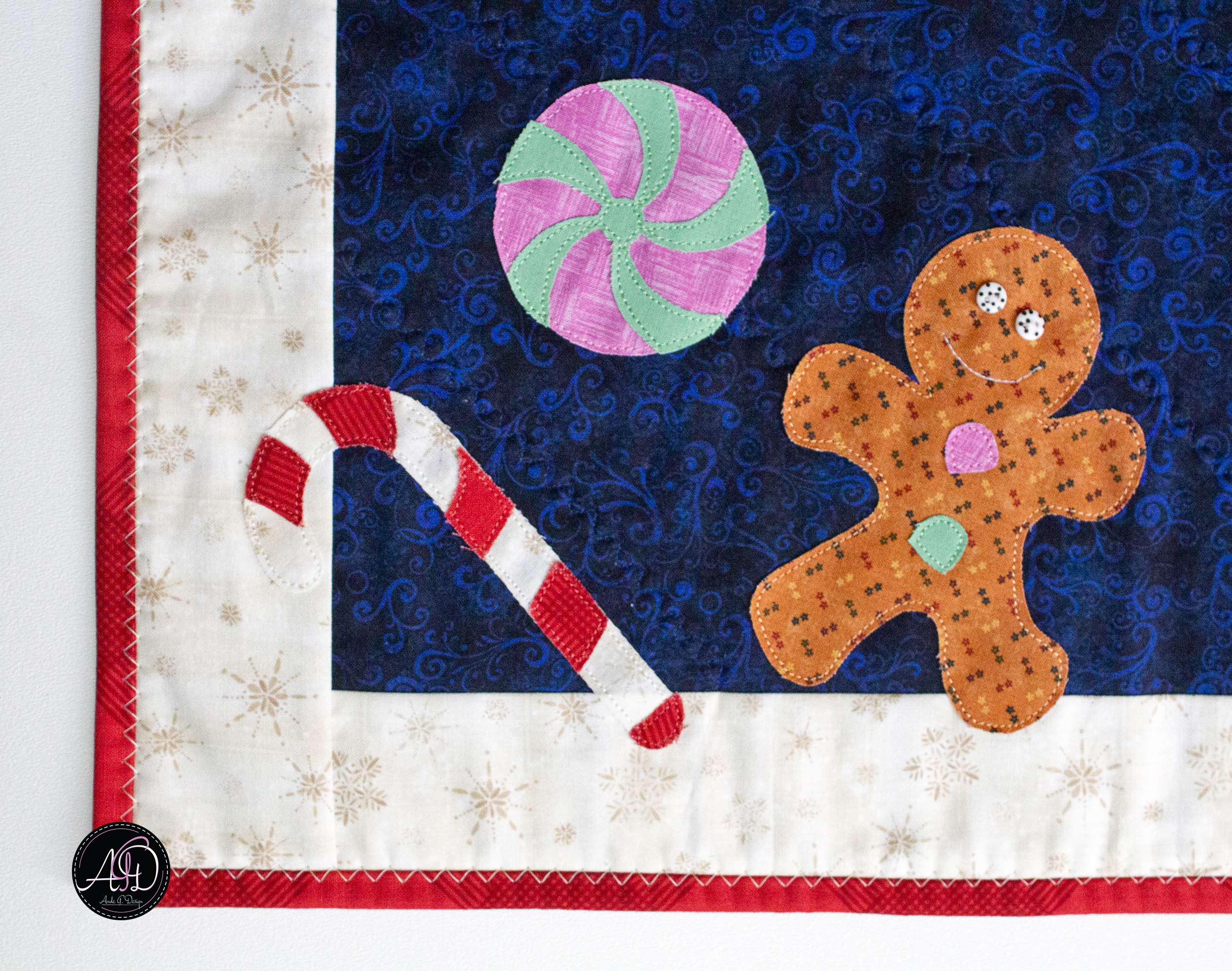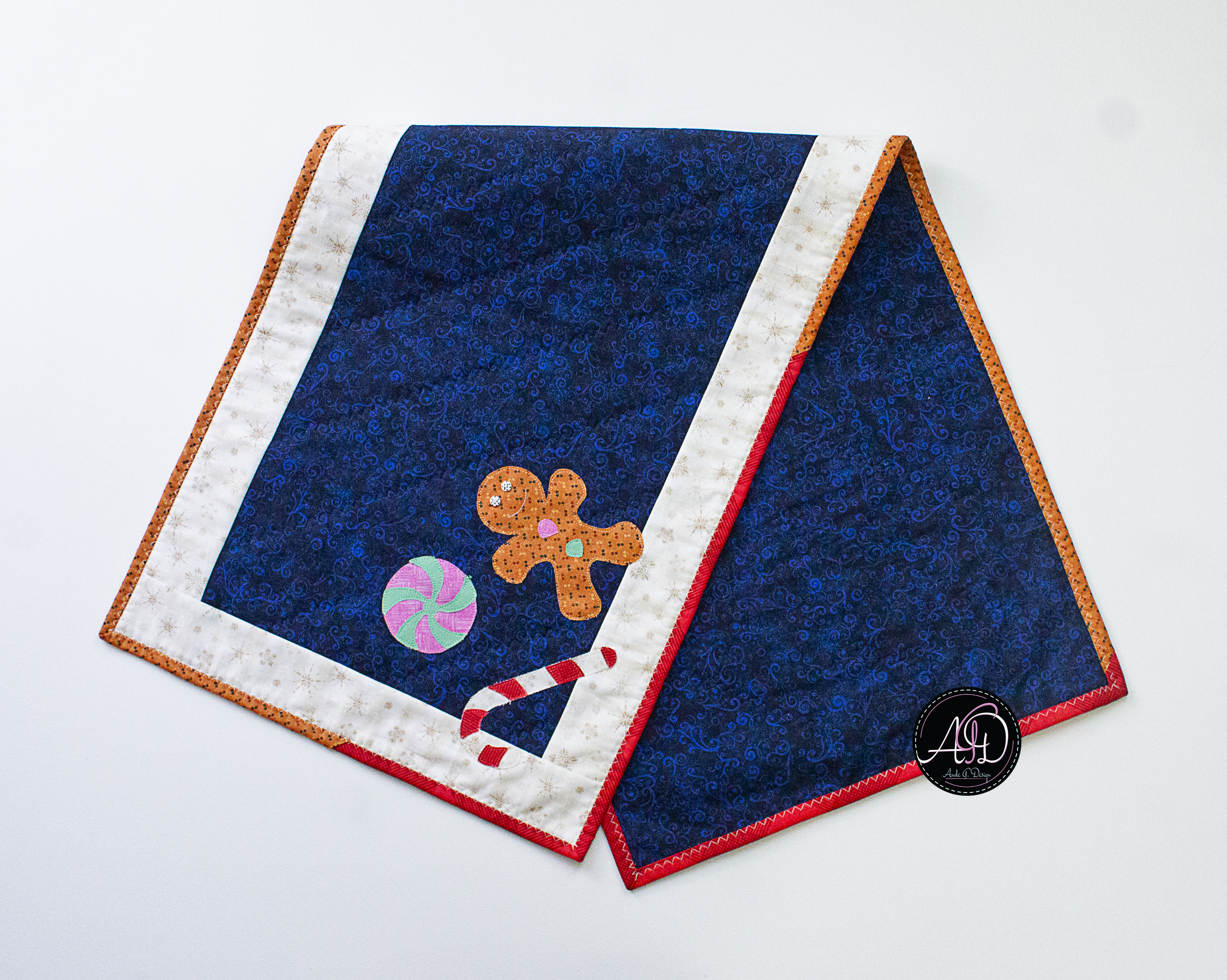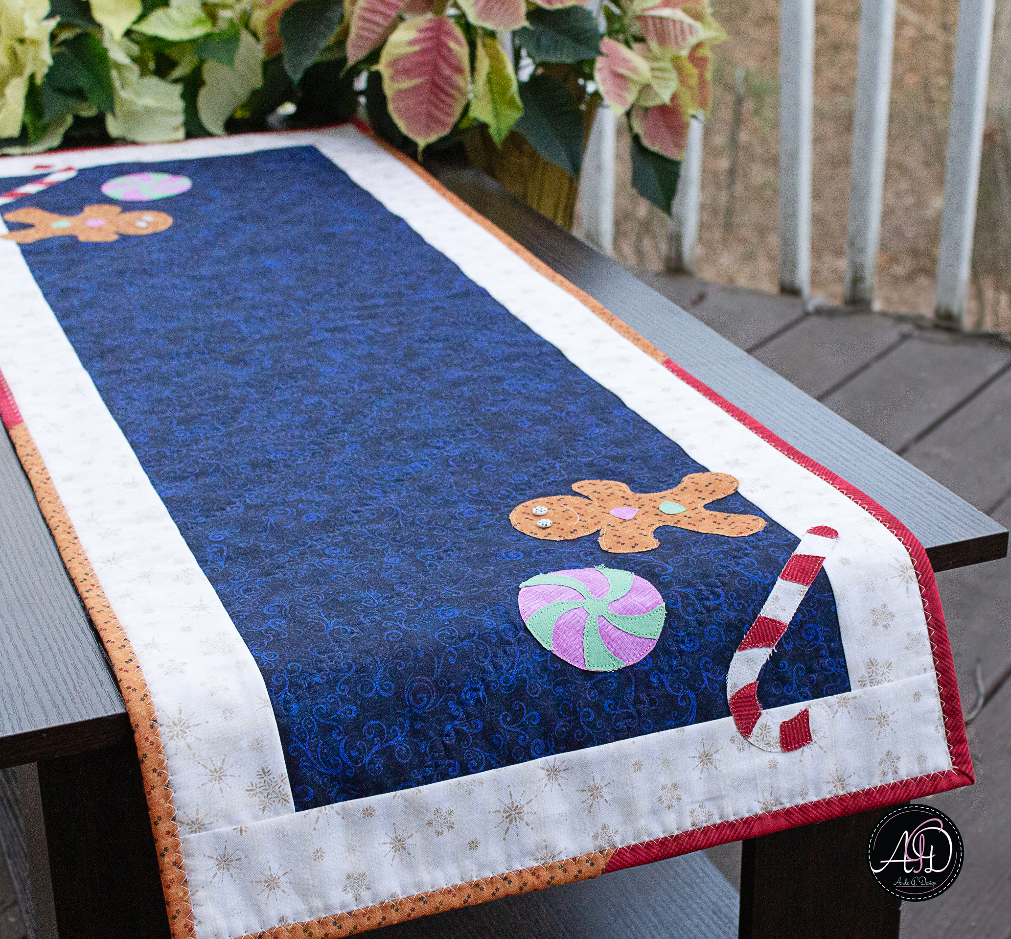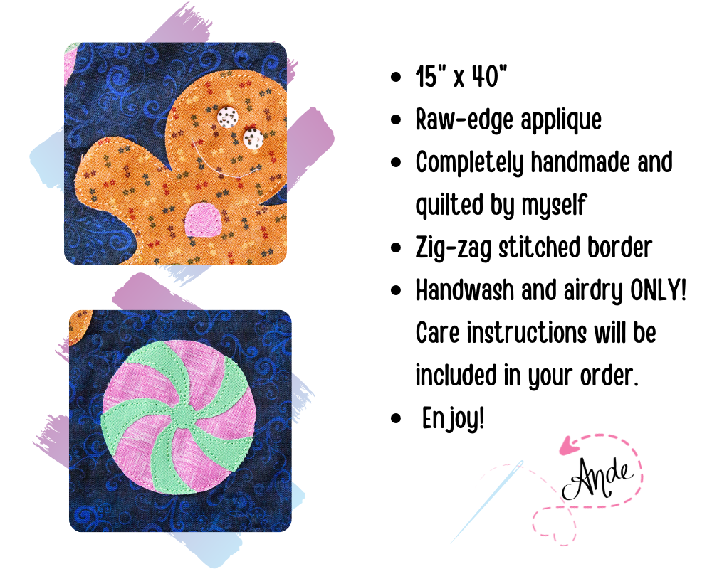 This Snowbell Hollow quilted table runner brings a playful holiday moment to your table, featuring a cheerful gingerbread man with gumdrop buttons and button-eyes, stitched smiles, and festive candy treats like candy canes and pink-and-green peppermint sweets. Whether styled on a dining table, kitchen island, or sideboard, this runner brings a heartfelt accent for homes that love handmade details and holiday traditions! The border is two-toned with brown and red colors. The backing is the same fabric that's captured on the front of the runner!