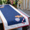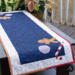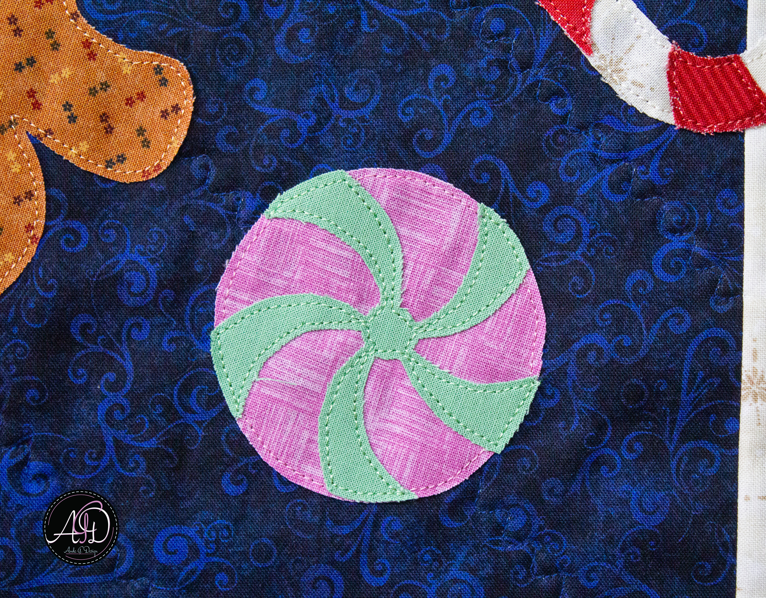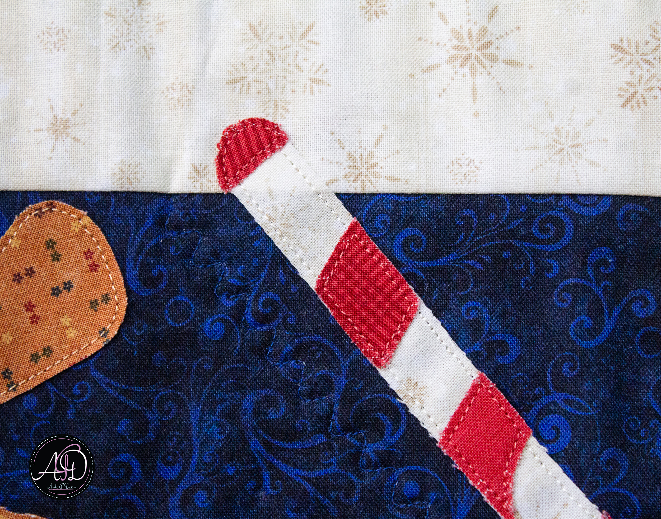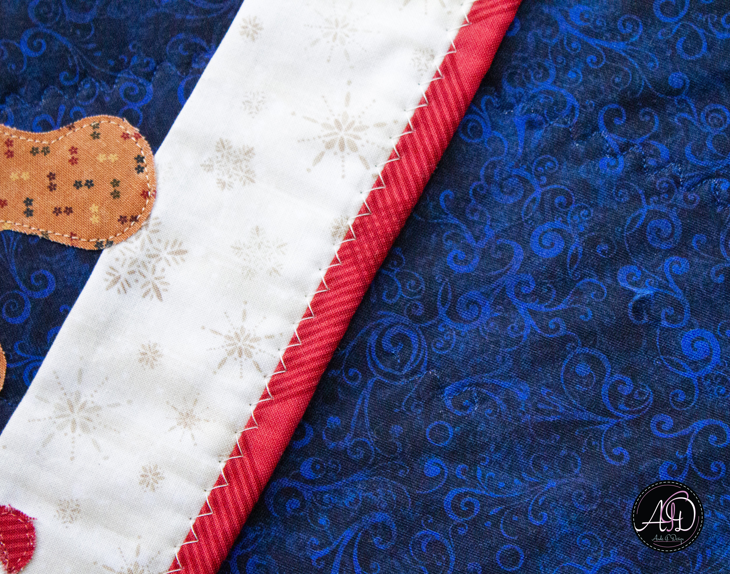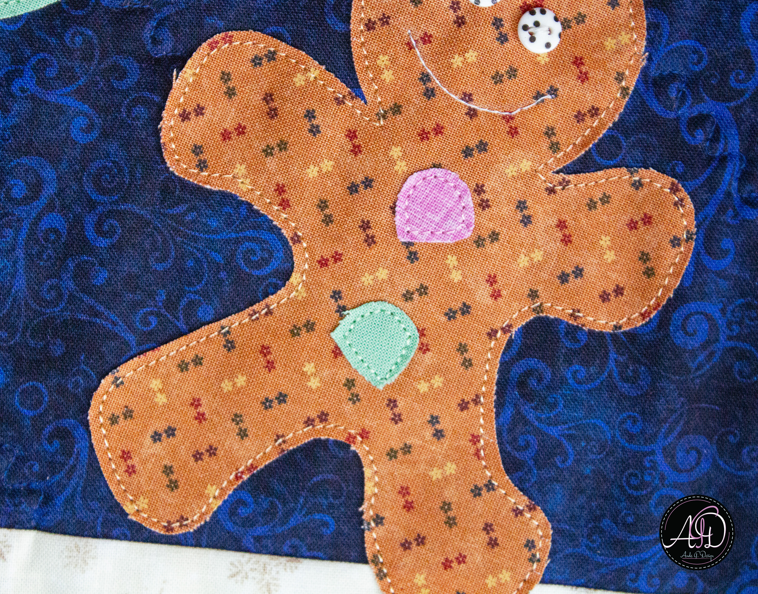 This Snowbell Hollow quilted table runner brings a playful holiday moment to your table, featuring a cheerful gingerbread man with gumdrop buttons and button-eyes, stitched smiles, and festive candy treats like candy canes and pink-and-green peppermint sweets. Whether styled on a dining table, kitchen island, or sideboard, this runner brings a heartfelt accent for homes that love handmade details and holiday traditions! The border is two-toned with brown and red colors. The backing is the same fabric that's captured on the front of the runner!