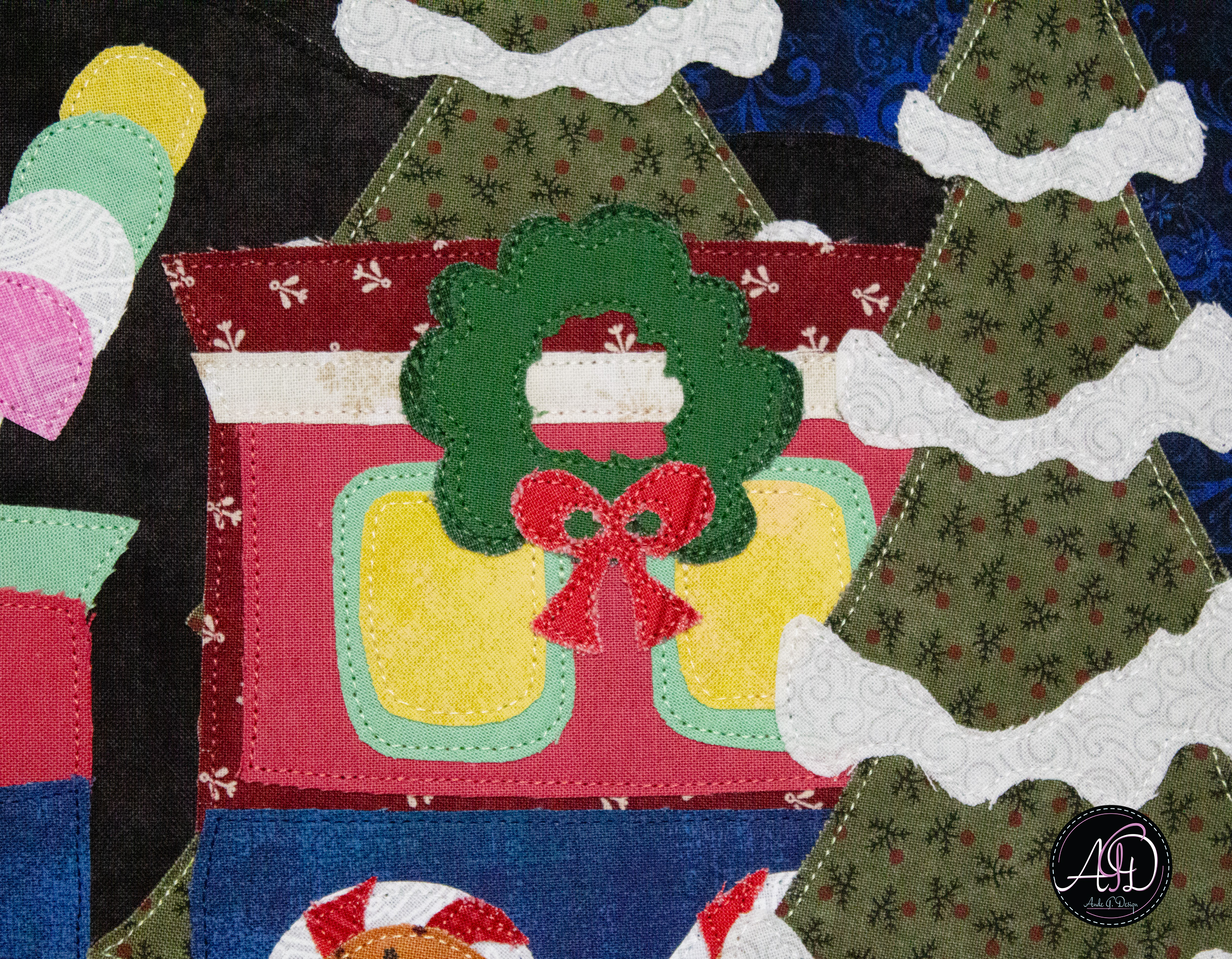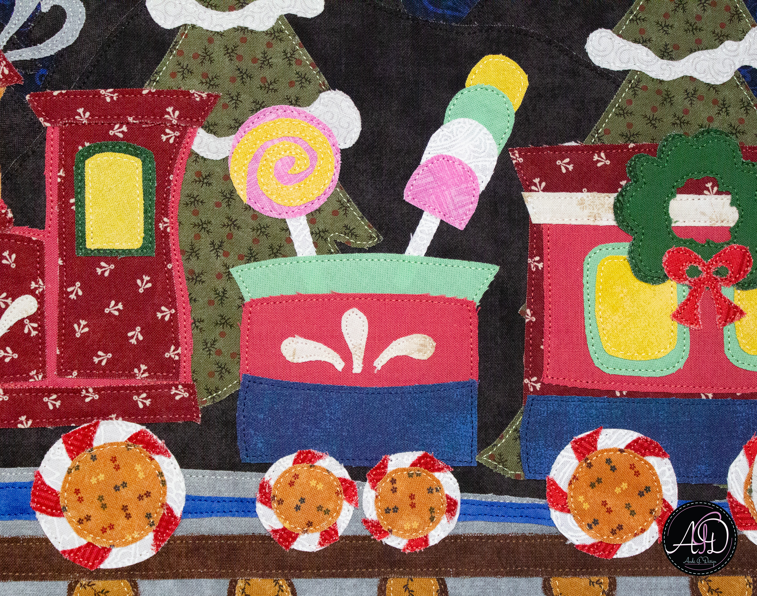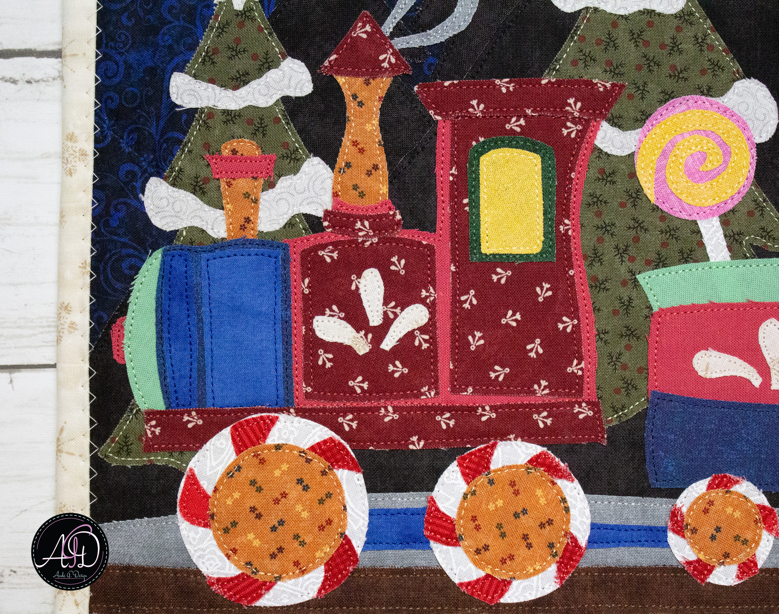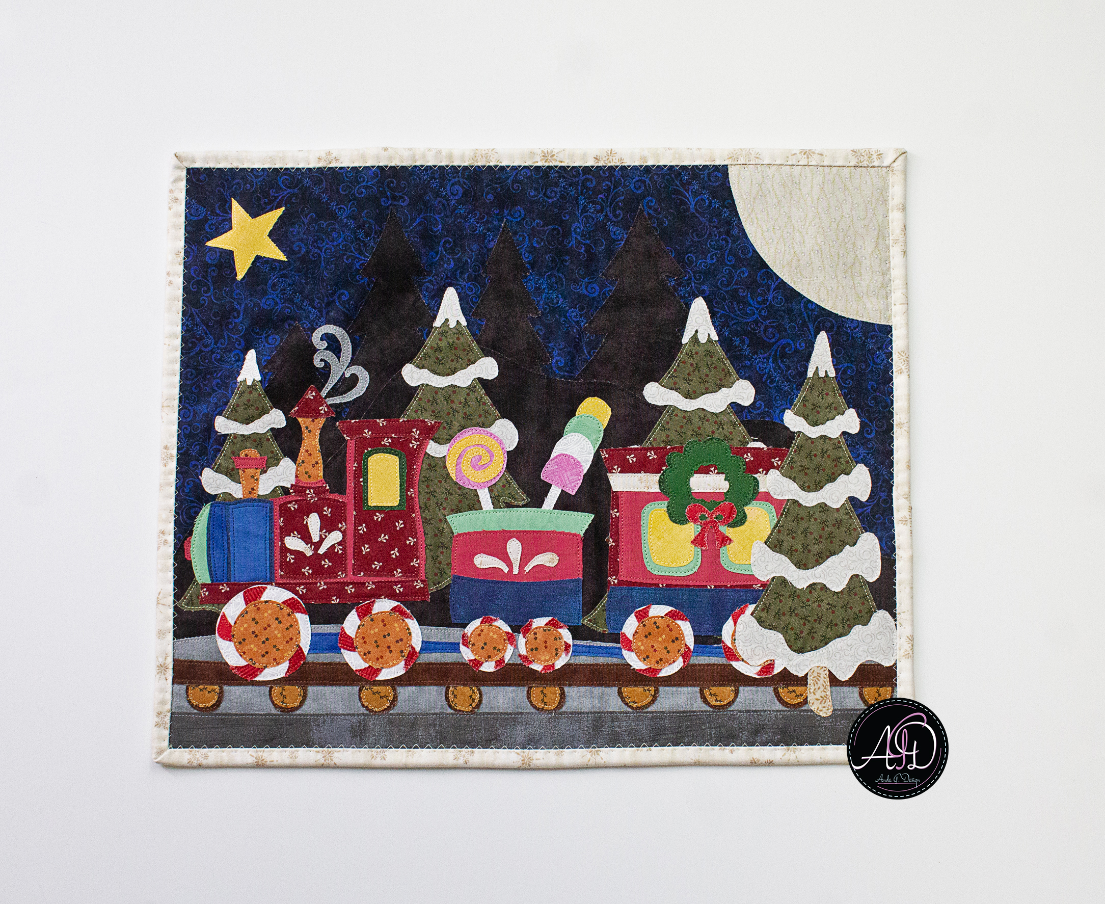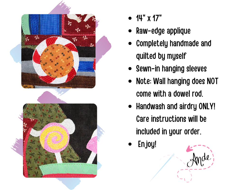 This Snowbell Hollow wall hanging captures a festive Christmas train on its way from the North Pole, glowing windows shining bright as it rolls past snowcapped trees, complete with candy lollipops, gumdrops, a cheerful wreath, and peppermint wheels beneath a moonlit sky filled with stars. Each detail invites a feeling of togetherness and quiet holiday celebration! Handcrafted with smiles, this piece is designed for those who love decorating with intention and story. The raw-edge appliqué is personally designed and cut, framed by a cream border, with a matching backing (same fabric as the background!). Finished with brown sewn-in hanging sleeves, it’s ready to bring handmade joy to your holiday home year after year!