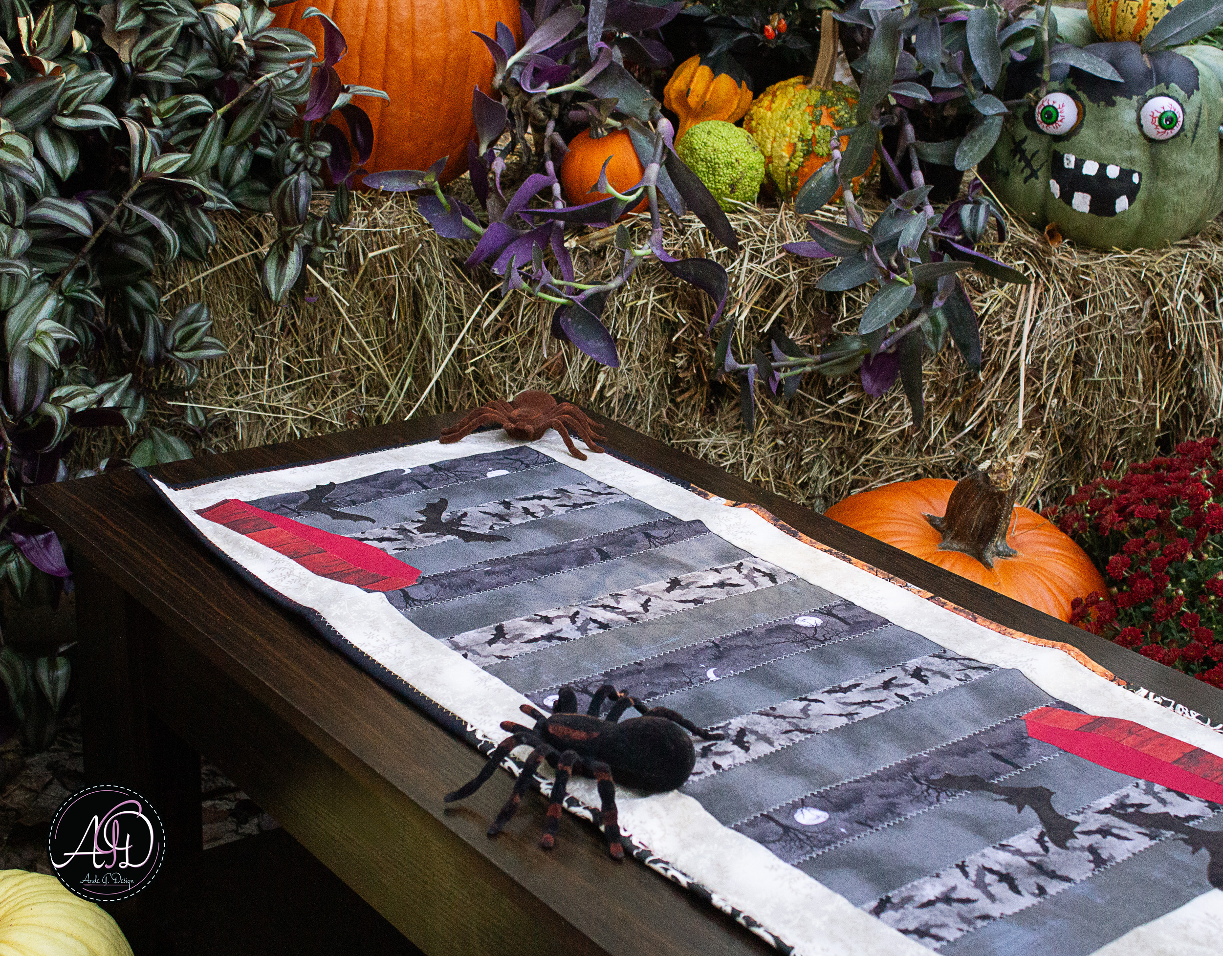 A coffin house that watches you as you walk by....creeping bats that circle....watch out! This table runner features appliqued coffins and bats, all against dark gray fabrics. The rim is two-toned cream and brown colors. Pairs perfectly with the Cravel Vampire's Coffin House wall hanging, or any other wall hanging in the Spellbook Hollow collection! This delicate piece is entirely handcrafted and free-motion quilted, created with heartfelt dedication. All appliques are raw-edge and personally designed and cut. The border is a variety of different halloween fabrics, while the backing is a spooky gray.