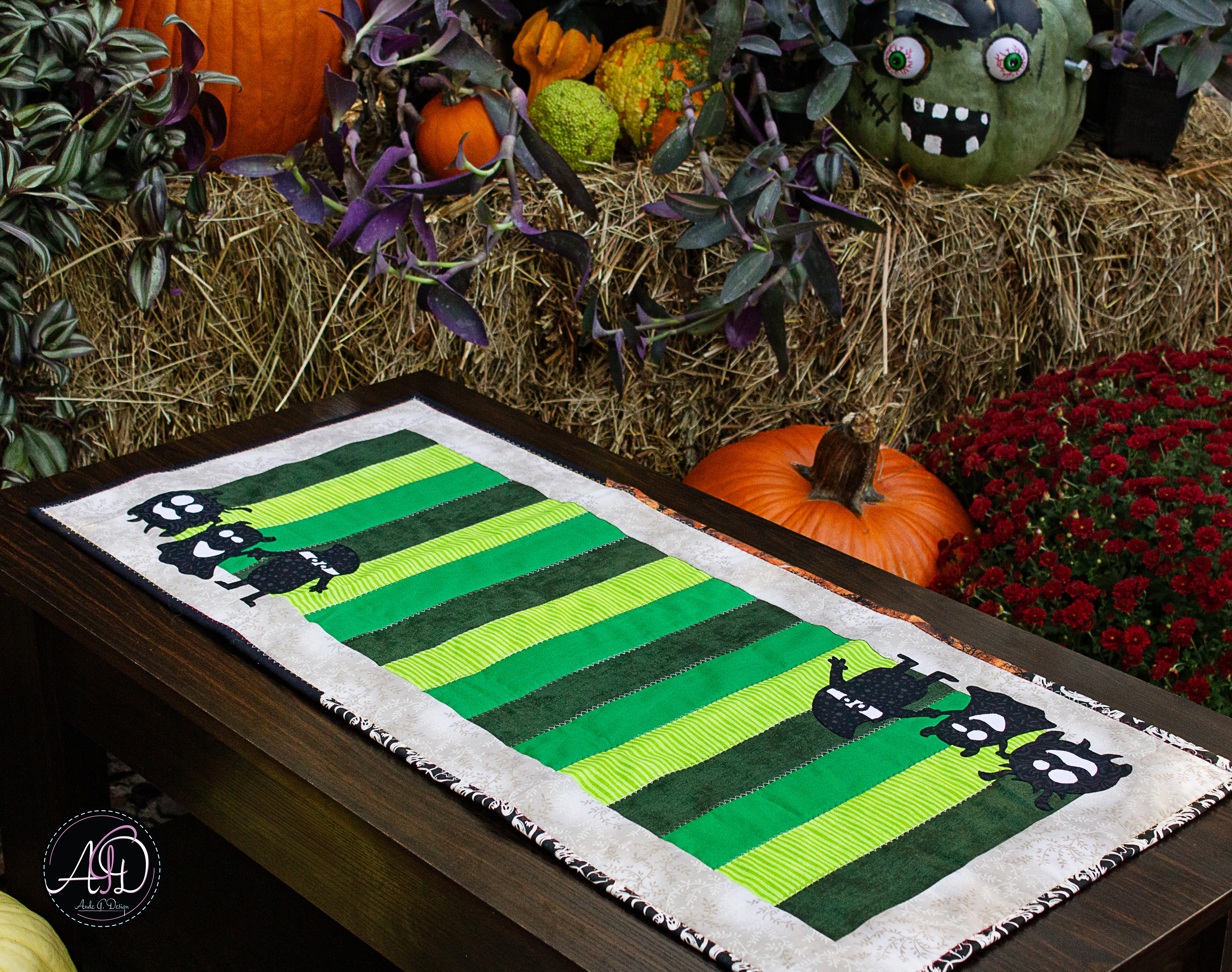 Grab your favorite monster, it's time to trick or treat! This table runner features appliqued monsters, all against green fabrics. The rim is two-toned cream and brown colors. Pairs perfectly with the Sambly Monsters House wall hanging, or any other wall hanging in the Spellbook Hollow collection! This delicate piece is entirely handcrafted and free-motion quilted, created with heartfelt dedication. All appliques are raw-edge and personally designed and cut. The border is a variety of different halloween fabrics, while the backing is a spooky gray.