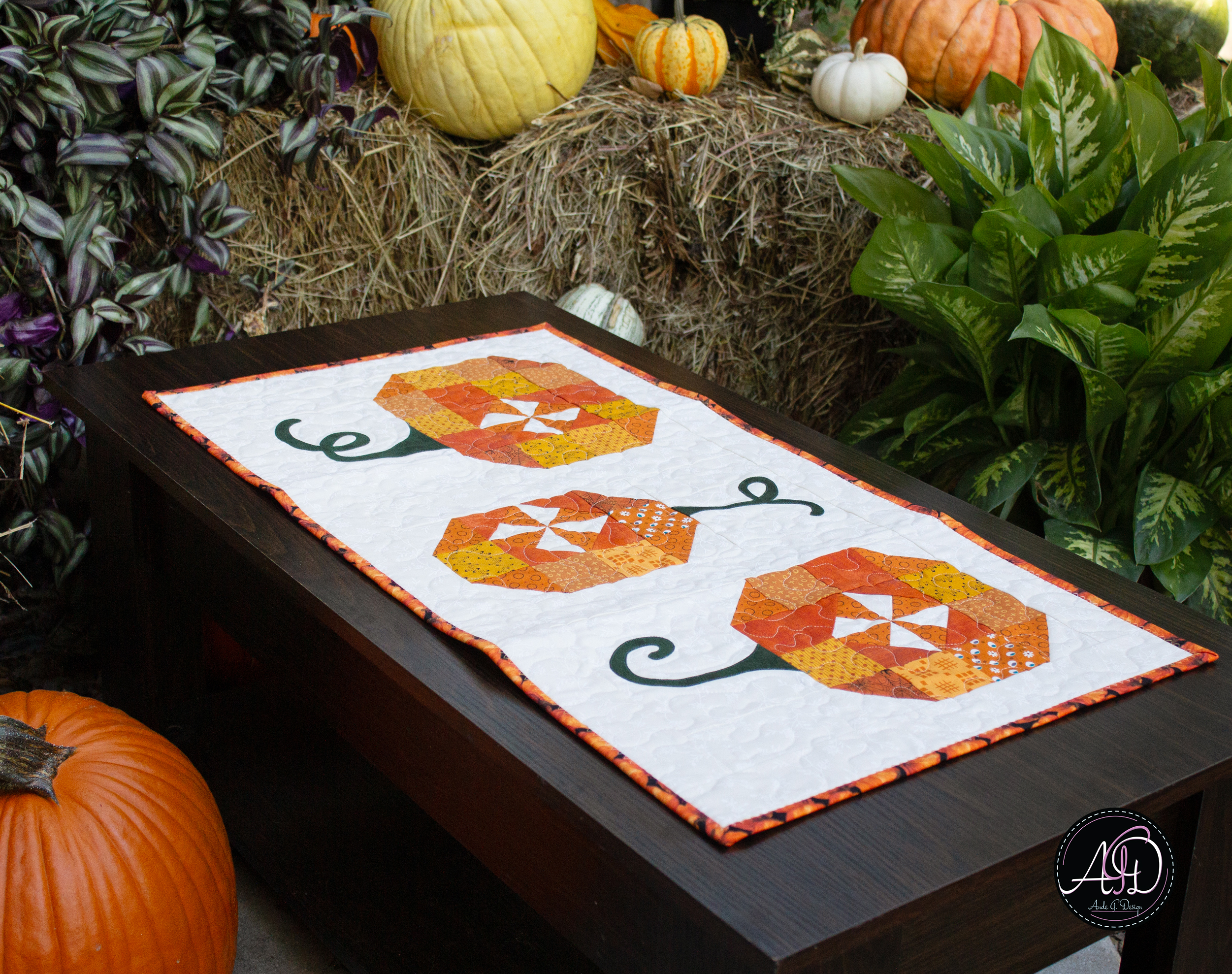What's your favorite pumpkin stem? The Pumpkin Twirls table runner showcases pumpkins with pinwheels and appliqued curly stems! This delicate piece is entirely handcrafted and free-motion quilted, created with heartfelt dedication. All appliques are raw-edge and personally designed and cut. The border is an orange fall leaves fabric, while the backing is a deep yellow/gold fabric.