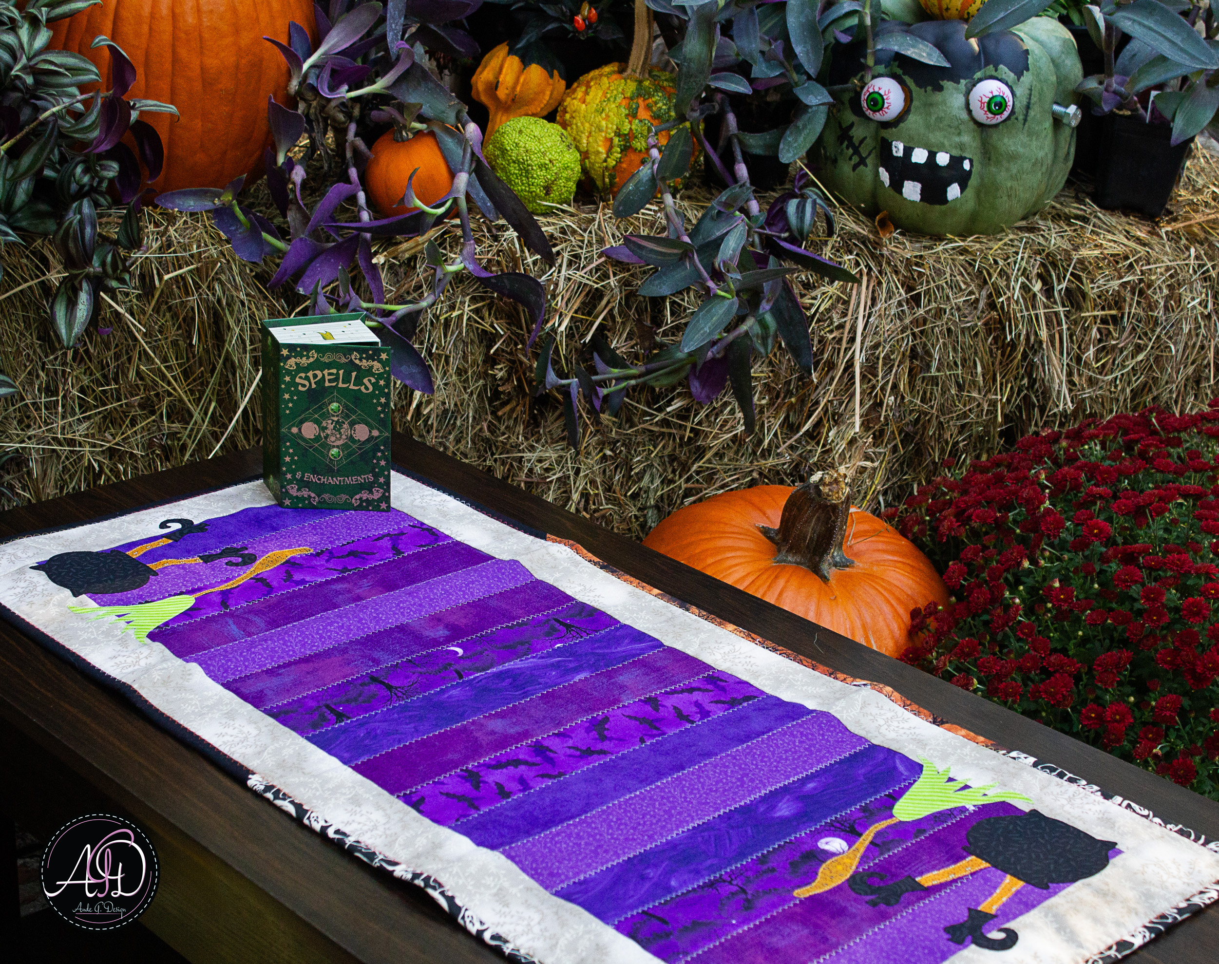 Whoops! Waybel the Witch fell into her cauldron while brewing a mystical potion for her neighbors! This magical table runner features appliqued witch legs inside a cauldron and a witch's broom all against purple fabrics. The rim is two-toned cream and brown colors. Pairs perfectly with Waybel Witch's House wall hanging, or any other wall hanging in the Spellbook Hollow collection! This delicate piece is entirely handcrafted and free-motion quilted, created with heartfelt dedication. All appliques are raw-edge and personally designed and cut. The border is a variety of different halloween fabrics, while the backing is a spooky gray.