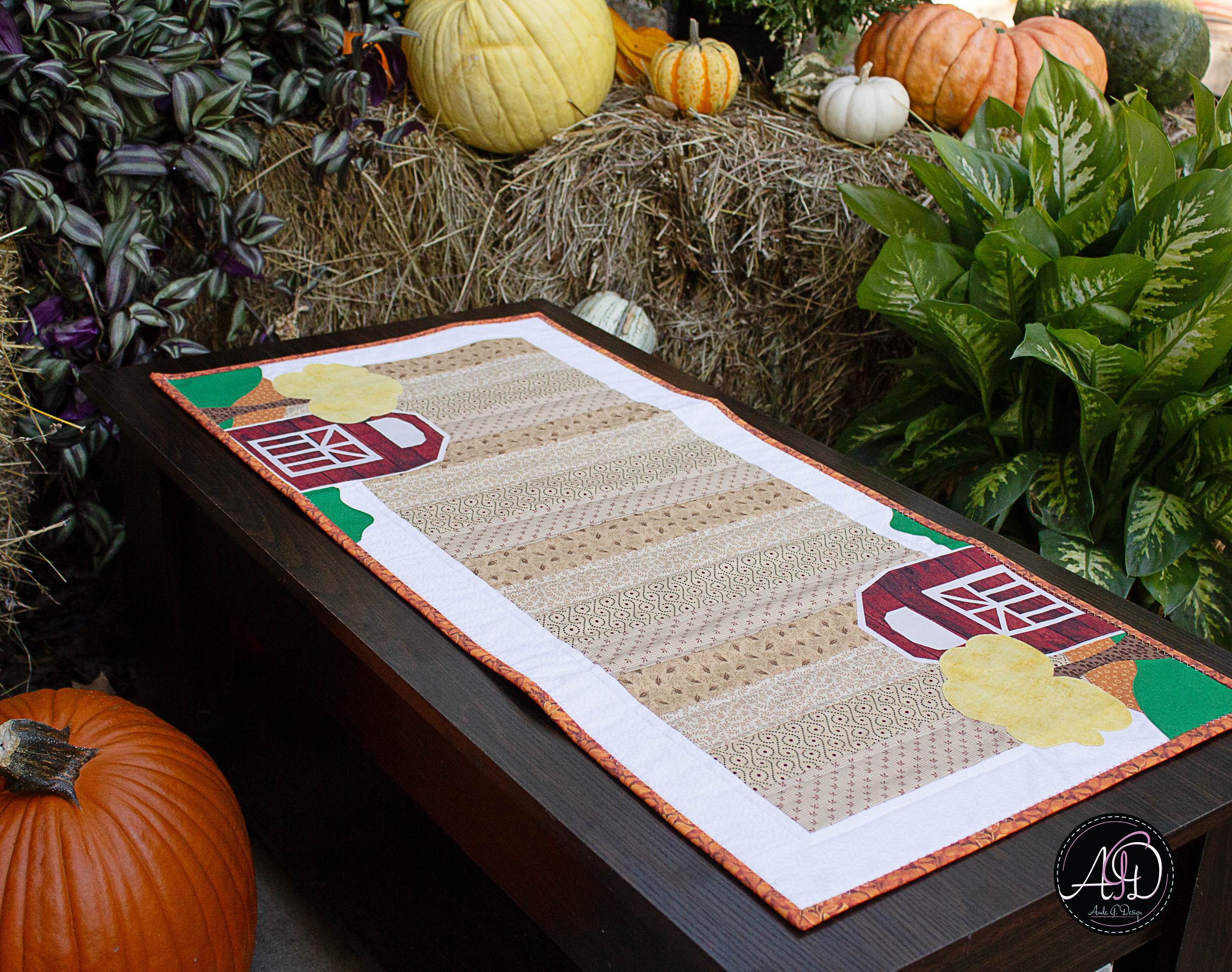 A gorgeous red barn snuggled in the rolling hills during the Autumn season! The Red Barn table runner showcases a carefully appliqued red barn and tree in a hillside landscape! This delicate piece is entirely handcrafted and free-motion quilted, created with heartfelt dedication. All appliques are raw-edge and personally designed and cut. The border is a black and orange pumpkin fabric, while the backing is a deep yellow/gold fabric.