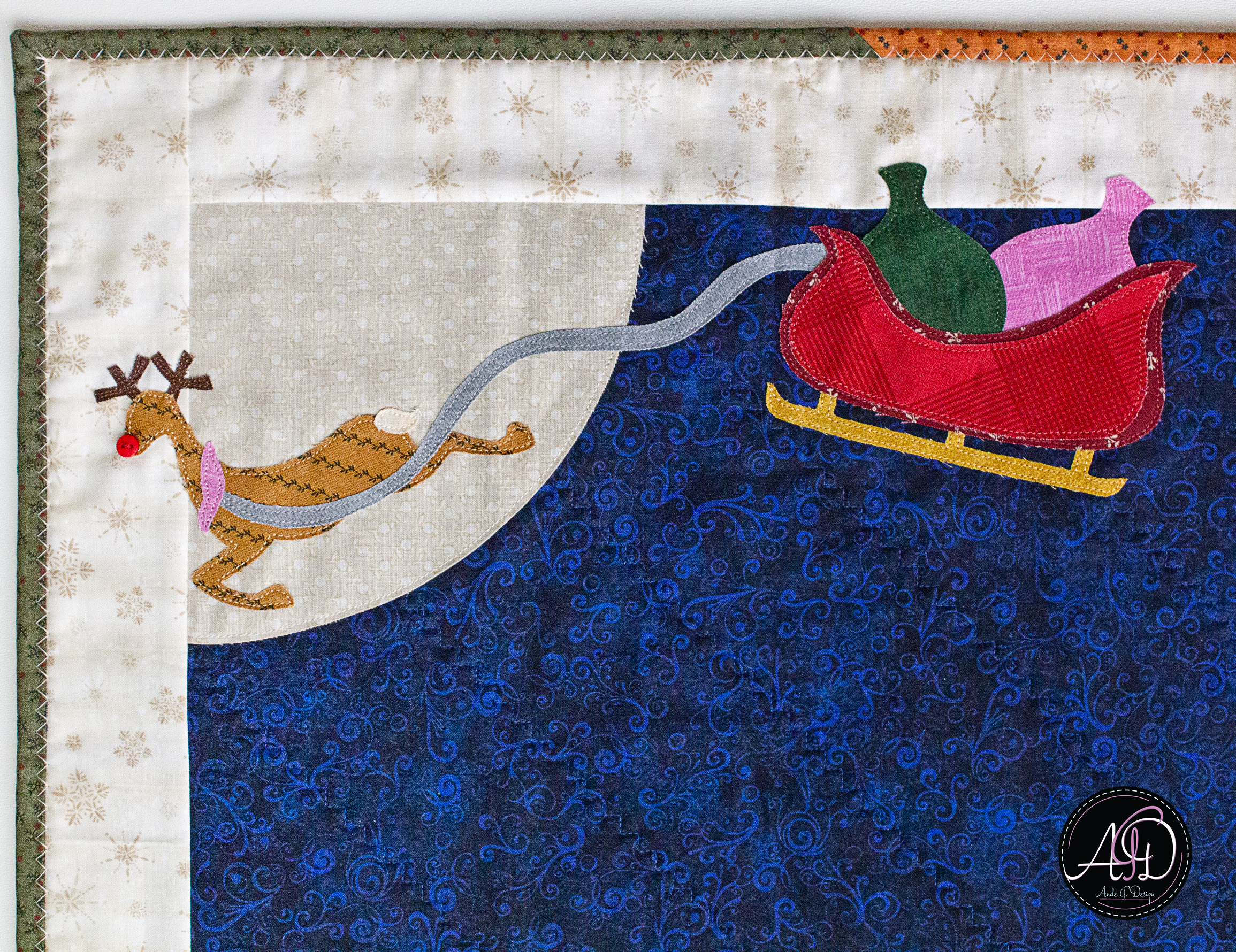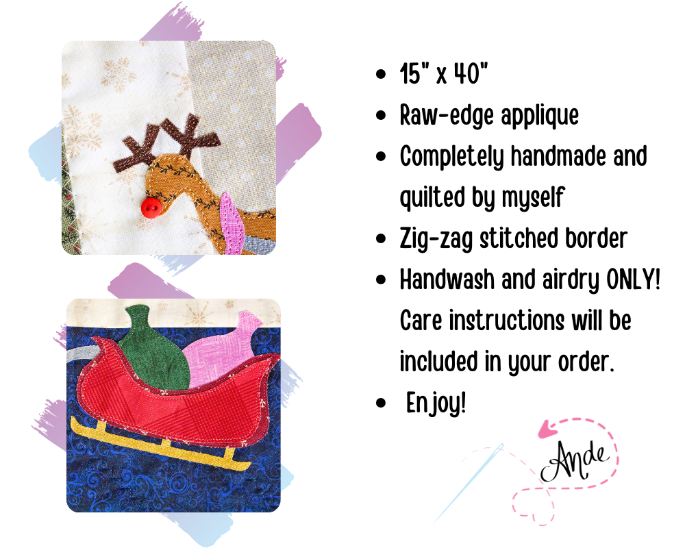 This Snowbell Hollow quilted table runner tells the story of a magical Christmas Eve, with Santa’s sleigh full of presents soaring past the moon, guided by Rudolph and his cheerful button nose. Whether styled on a dining table, kitchen island, or sideboard, this runner brings a heartfelt accent for homes that love handmade details and holiday traditions! The border is three-toned with forest green, red, and brown colors. The backing is the same fabric that's captured on the front of the runner.